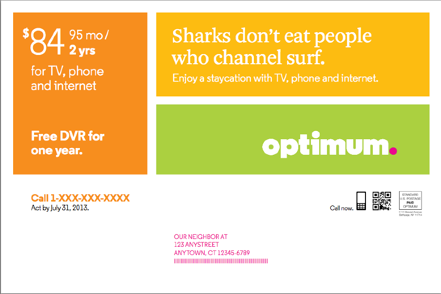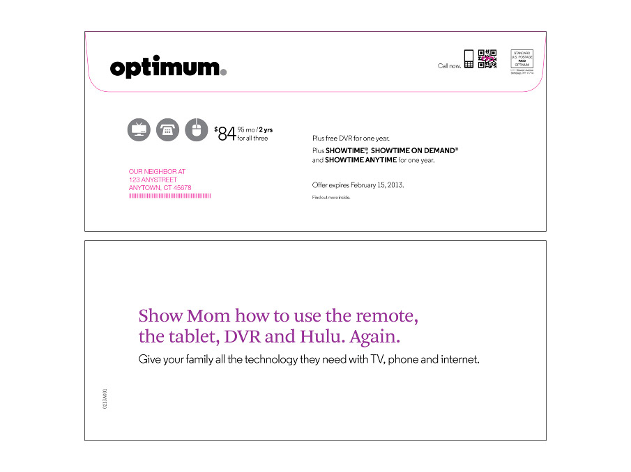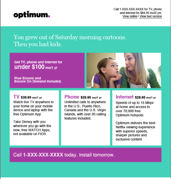 Witty and relatable headlines that conjure up real life moments where Optimum's services would fit into the readers' lives, accompanied by a relevant product offer.